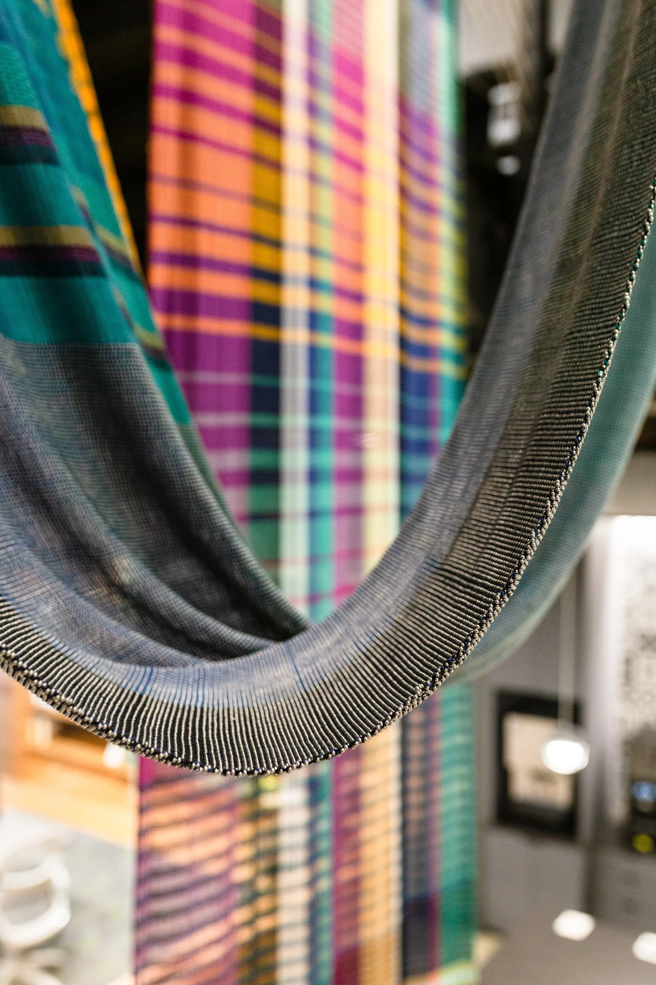 Weight in a Field of Color is a site specific project created for the stairwell of the Credit Human building, San Antonio. This work consists of seven 30 foot weavings cascading from the 11th to the 5th floor. Each textile incorporates stainless steel ball chain into the brightly colored cotton warps, adding weight to the valley of each drape. The utilitarian history of the metal ball chain is elevated to an elegant material, catching and reflecting light. Each weaving incorporates the same five colors but is executed to create vastly different textiles. This work was handwoven in Lexington Kentucky over 6 months in the summer and fall of 2021.